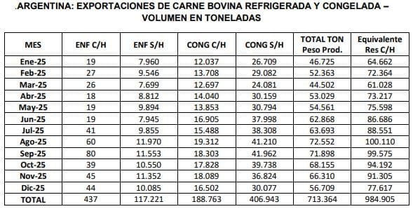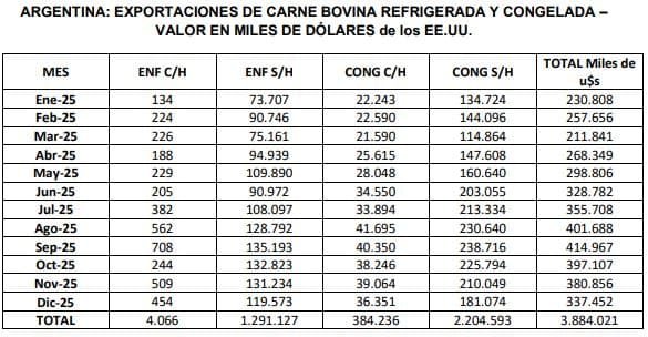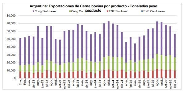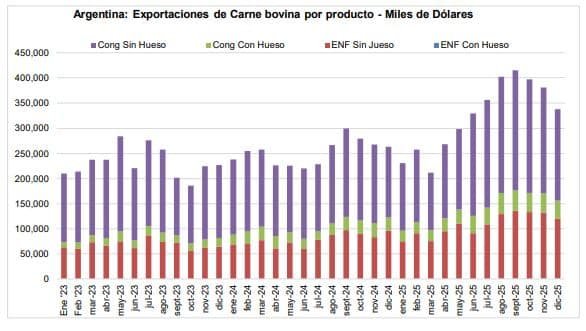 Las exportaciones del mes de diciembre de 2025 alcanzaron un volumen cercano a las 56,7 mil toneladas peso producto de carne bovina refrigerada y congelada; por un valor del orden de los 337,5 millones de dólares. Con respecto al mes de noviembre de 2025, los volúmenes embarcados muestran una caída significativa, del (-14,5%); mientras que el valor obtenido muestra un retroceso más moderado, del (-11,4%).