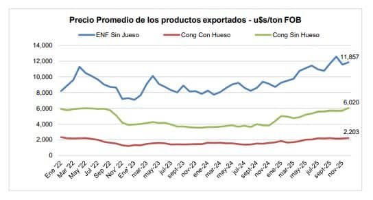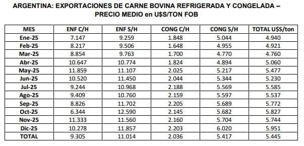 El precio promedio de exportación de carne bovina refrigerada y congelada resultó en el mes de diciembre de 2025 de u$s 5.951 por tonelada. Este valor resulta un (+3,6%) superior al obtenido en noviembre último; y un (+33,1%) más elevado que el precio medio de diciembre de 2024, que había sido de u$s 4.471 por tonelada. En los últimos años, se observa una persistente tendencia a la baja de los precios en los principales destinos desde el mes de mayo de 2022 en adelante, que se ha revertido parcialmente desde mediados del segundo trimestre de 2025; y los u$s 5.951 dólares promedio por tonelada obtenidos en el mes de diciembre se ubican alrededor de u$s 350 por tonelada por debajo de los máximos registrados en abril de 2022.