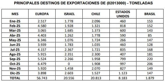 En diciembre de 2025, se exportaron 16,5 mil toneladas de carne congelada con hueso y