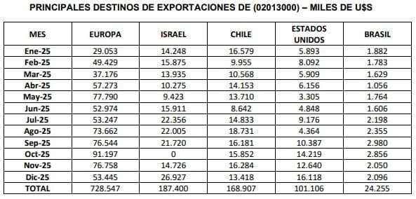 En diciembre de 2025, se exportaron 30,1 mil toneladas de carne bovina congelada sin hueso, por un valor de 181,1 millones de dólares. El precio promedio de las exportaciones de carne bovina congelada sin hueso resultó de 6.020 dólares por tonelada. Como consecuencia de menores embarques con destino a China que no llegaron a ser compensados por los volúmenes crecientes destinados a Israel y a los EE. UU, los volúmenes exportados de carne congelada deshuesada caen significativamente, con una variación de un (-18,3%) con respecto al mes precedente; y también resultan (-6,7%) inferiores a los volúmenes embarcados en diciembre de 2024. A lo largo del año 2025, las exportaciones de esta partida alcanzaron las 406,9 mil toneladas; un (-14,3%) por debajo de las 475,0 mil toneladas registradas entre enero y diciembre de 2024. El ingreso de divisas por exportaciones de carne bovina congelada deshuesada durante el año 2025 resultó cercano a 2.204,6 millones de dólares; un (+22,3%) superior a los 1.802,9 millones que se habían facturado entre enero y diciembre de 2024.