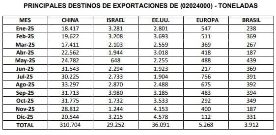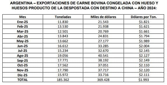 diciembre como para el acumulado del año 2025. En el último mes, se embarcaron con destino a China 16,0 mil toneladas de carne con hueso y huesos bovinos producto de la despostada, por un valor de 33,7 millones de dólares y aproximadamente 20,5 mil toneladas de carne bovina deshuesada, por un valor de 105,9 millones de dólares. China representó el 64,4% de los volúmenes exportados en diciembre de 2025; y el 69,5% del acumulado del año 2025. El precio medio de las ventas a China de carne sin hueso en diciembre de 2025 se ubicó alrededor de los u$s 5.150 por tonelada, marcando todavía un apreciable recorte con respecto al máximo de u$s 5.900 obtenido en mayo de 2022.