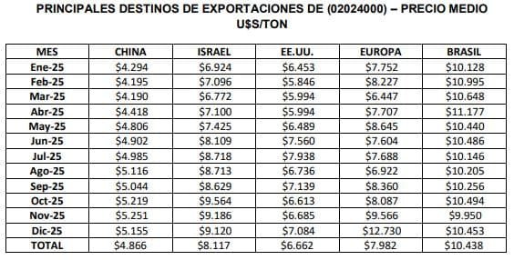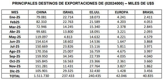 2025 resultaron la República Popular China (20,5 mil toneladas / 105,9 millones de u$s),