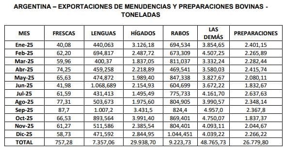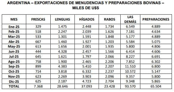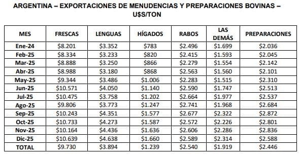 diciembre de 2025 totalizaron un volumen de 10,7 mil toneladas, por un valor de 25,5 millones de dólares. El precio medio de exportación de estos productos se ubicó levemente por encima de los u$s 2.370 por tonelada, con picos superiores a los u$s 4.630 para el producto lenguas bovinas. A lo largo del año 2025, las ventas de menudencias y preparaciones bovinas treparon a un volumen de 122,8 mil toneladas, por un valor de 255,6 millones de dólares.