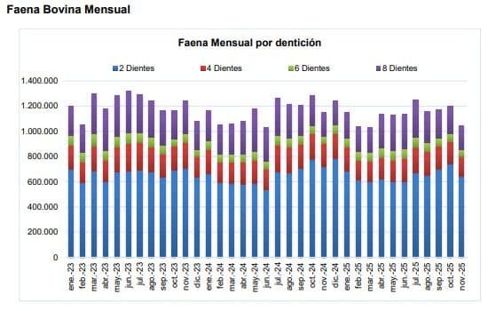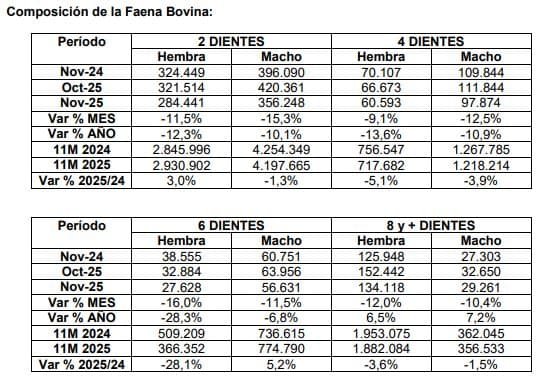 En los primeros once meses del año 2025, se faenaron 12,44 millones de bovinos; un (-1,9%) menos que los 12,69 millones que se habían faenado entre enero y noviembre de 2024. Las mayores diferencias interanuales en la faena provienen de las hembras de ocho y más dientes, que recortaron en 71,0 mil cabezas la faena acumulada en los primeros once meses del año pasado, las hembras de seis dientes, que mostraron una caída interanual de la faena cercana a las 142,9 mil cabezas, y, por los machos de cuatro dientes, cuya faena disminuyó en cerca de 45,7 mil cabezas a la registrada entre enero y noviembre del año 2024; en sentido contrario, se incrementó la faena de hembras de dos dientes en aproximadamente 84,9 mil cabezas, y la de novillos de seis dientes en 42,9 mil cabezas.