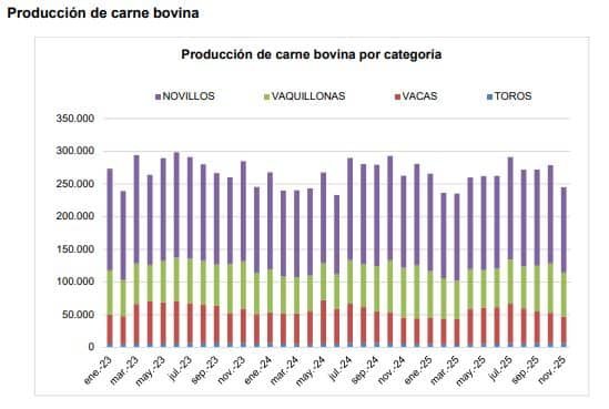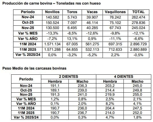 La producción de carne bovina del mes de noviembre de 2025 alcanzó las 245,0 mil toneladas res con hueso, recortándose en cerca de 33,8 mil toneladas con respecto al mes anterior, y exhibiendo una moderada caída, de 17,5 mil toneladas, con respecto al mes de noviembre del año 2024. En los primeros once meses del año 2025, la producción de carne bovina alcanzó los 2,881 millones de toneladas equivalente res con hueso; situándose 15,8 mil toneladas por debajo del acumulado del período enero a noviembre de 2024, que había ascendido a 2,897 millones de toneladas equivalente res con hueso.