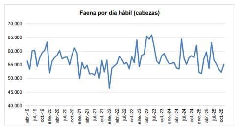 La faena diaria del mes de noviembre del corriente año, se ubicó en 55,1 mil cabezas, un