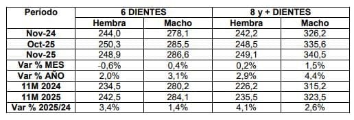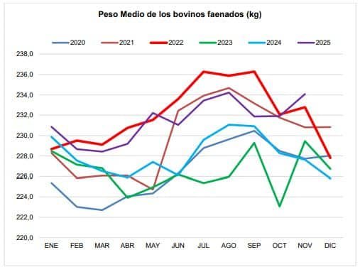 El peso promedio de las carcasas bovinas correspondiente al undécimo mes del corriente año alcanzó los 234,1 kilogramos, siendo levemente superior, (+0,9%), a los 231,9 kilogramos del último mes de octubre; y resultando moderadamente superior, (+2,8%), a los 227,6 kilos de noviembre de 2024. El peso medio de las carcasas durante los once meses que han transcurrido del corriente año se ubicó en 231,5 kilogramos; un (+1,4%) por encima de los 228,3 kilogramos del mismo periodo del año anterior.
