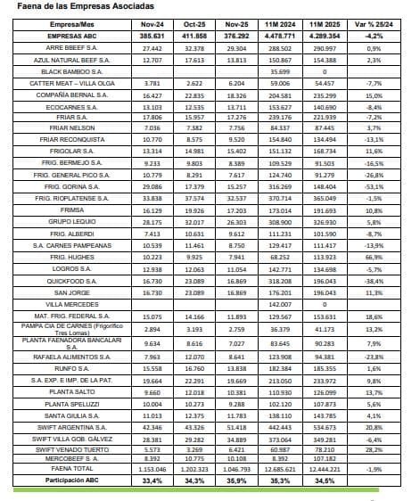 La faena de noviembre de 2025 se reduce en 155,5 mil cabezas con respecto al mes anterior, (-12,9%) y paralelamente, la faena de las empresas asociadas al consorcio se recorta en 35,6 mil cabezas, (-8,6%).