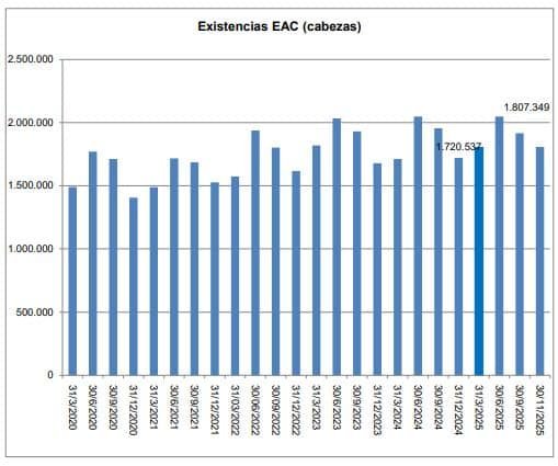 Al 30 de noviembre de 2025, los establecimientos de engorde a corral acumulan existencias cercanas a los 1,807 millones de bovinos (SENASA), moderadamente superior, (+5%), al volumen de encierres contabilizados al cierre del cuarto trimestre del año pasado, que había tocado los 1,720 millones al 31 de diciembre.