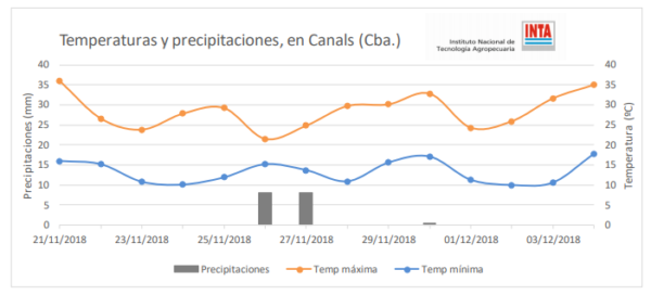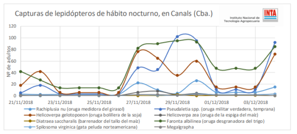 Durante el período del 21 de octubre al 4 de diciembre de 2018 se registró un total de precipitaciones de 16,5 mm. Fuente temperaturas: http://sivimet.agroindustria.gob.ar/GISWEB/ (Bolsa de Cereales de Córdoba). Durante el mismo período se destaca un pico de presencia de adultos de oruga militar verdadera temprana (Pseudaletia spp.), oruga desgranadora del trigo (Faronta albilinea), y oruga bolillera (Helicoverpa gelotopoeon), y con menor magnitud, picos de oruga medidora (Rachiplusia nu). Se recomienda monitorear los lotes de cultivos, ya que podría observarse presencia de larvas de dichas plagas. Ante cualquier duda consulte a su Ingeniero/a Agrónomo/a.