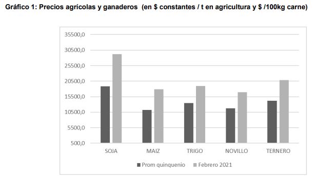 Para estimar la situación actual se elaboró el gráfico 1 que compara (en $ de febrero 2021) los precios de productos del quinquenio 2016 /2020 respecto a los vigentes en febrero 2021.