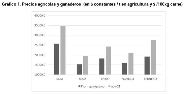 Para estimar la situación actual se elaboró el gráfico 1 que compara (en $ de noviembre 2021) los precios de productos del quinquenio 2016 /2020 respecto a los vigentes en noviembre 2021.
