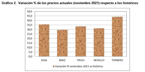 Se observa que se mantiene el importante incremento respecto a los valores históricos en los tres cultivos. A su vez en ganadería bovina se produjo también un mejoramiento respecto a los bajos valores del quinquenio, cabe aclarar que este cambio favoreció más a la categoría de terneros. En el gráfico 2 se muestra la variación porcentual de precios actuales respecto a los del quinquenio.