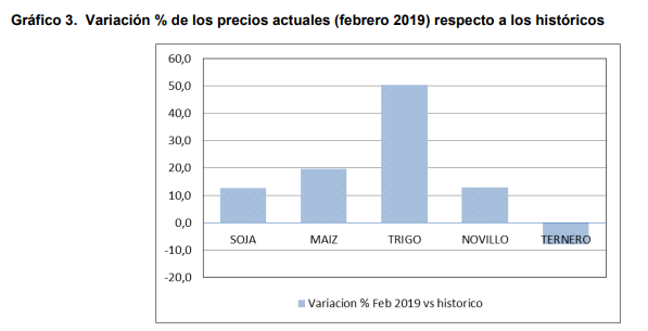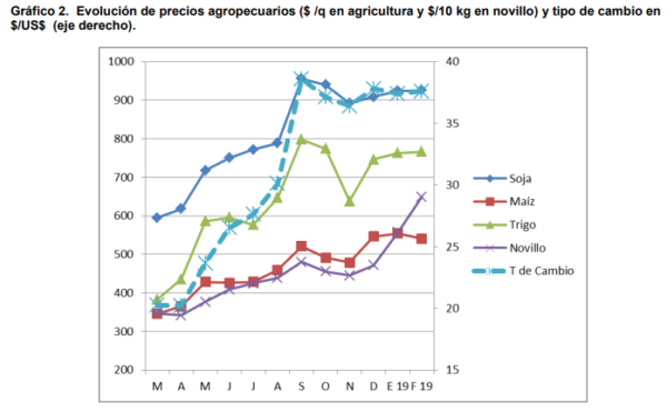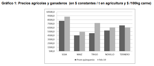 En el lapso entre noviembre 2018 a febrero 2019 no se produjeron modificaciones de importancia en los indicadores macroeconómicos. De este modo el tipo de cambio nominal subió un 4,4 % mientras que el índice de precios mayoristas (IPIM) se incrementó un 1,9 % con lo cual el tipo de cambio real (TCR) tuvo solo un leve cambio favorable del 2,5 % en su competitividad. Para estimar la situación actual se elaboró el gráfico 1 que compara (en $ de febrero 2019) los precios de productos del quinquenio 2014 /2018 respecto a los vigentes en febrero 2019.
