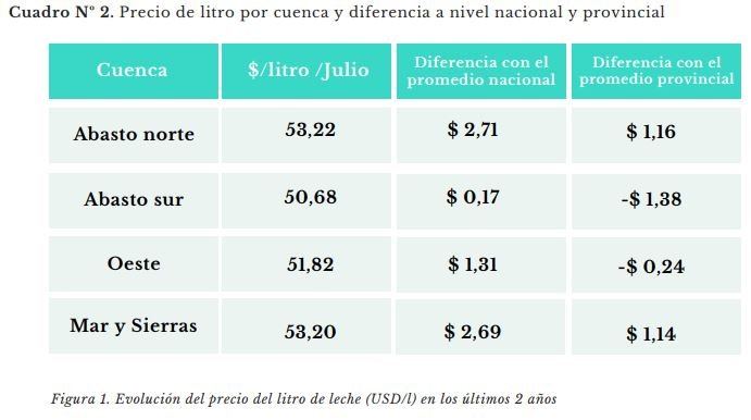 La DNL informa que el precio para el mes de julio a nivel nacional fue de 50,51 $/l lo que implica un aumento respecto del mes anterior de 5,6%. Un incremento similar se registra en todas las cuencas del país. Dentro de la provincia de Buenos Aires se encuentran diferencias siendo la cuenca de abasto norte la que logra un mayor precio con 53,22 $/l. La cuenca Oeste registra 51,82 $/litro y todas tienen un diferencial de precio positivo respecto al nivel nacional (Cuadro N°2). El peso argentino se devaluó en un 5,1% y confirma una tendencia hacia devaluaciones más pronunciadas en los últimos meses. No obstante, se mantiene la brecha cambiaria con los otros tipos de dólar. Aun así, el precio de la leche si lo medimos en dólares está en 0,39 USD/l y 0,08 USD/l encima del promedio de los últimos 24 meses (Figura 1). El precio del maíz volvió a bajar y esto implica una mejora sustancial en los términos de intercambio litros de leche/kilos de maíz. Hoy con 57 litros se pueden obtener 100 kilos de maíz, una diferencia sustancial a los 65 litros que indicaba el anterior informe (Figura 2). La Cámara Argentina de Contratistas Forrajeros (CACF) actualizó sus precios de referencia (Cuadro N°5) y según cálculos con insumos de la zona de Trenque Lauquen un maíz con uso de alta tecnología con un rinde de 35 t MV/ha tendría un costo de 13,6 $/Kg Ms, incluyendo su confección (Cuadro N°4).