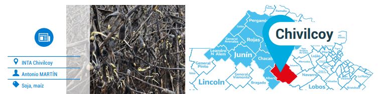 Desde el punto de vista del déficit de lluvias y altas temperaturas del período, que generaron un impacto negativo en el desarrollo y rendimiento de los cultivos, con mayor incidencia en la soja de segunda y maíces tardíos. Para el partido de Chivilcoy, entre los meses de noviembre de 2017 hasta marzo de 2018 las lluvias registradas fueron de 167 mm (Nov: 11 mm, Dic: 28 mm, Ene: 37 mm, Feb: 48 mm, y Marzo: 43 mm) cubriendo apenas un 32 % de los registros promedio de dichos meses. A partir del mes de abril de 2018 hubo un cambio drástico en el patrón de lluvias, y desde el 1 de abril hasta la fecha del informe (16/05) se llevan medidos 421 mm, de los cuales 305 corresponden a abril y 116 a lo que va de mayo. Es importante señalar que el partido de Chivilcoy no solicitó la emergencia agropecuaria por sequía, en su momento. En base a esto, es muy poco lo que se pudo avanzar con la cosecha de soja y maíz en el partido. Ambos cultivos han sufrido el impacto de la persistencia de días con lluvias y alta humedad relativa ambiente, provocando el deterioro comercial en los granos (manchado y brotado), más pérdidas por desgrane en soja de primera (apertura natural de vainas). Se están evaluando las pérdidas de acuerdo a la mercadería recibida con humedad entre 18 y 21 %, y con granos dañados entre un 15 hasta un 60 % en las plantas de acopio locales. Aparentemente el dañado en soja de segunda es mucho menor, pero con rindes muy magros, se estima entre 300 y 1500 kg/ha, los menos. Antes de las lluvias de abril los rindes estaban entre 4500 a 6000 kg/ha para Maíz, es decir, un 40 a 50 % por debajo del promedio de una campaña normal a buena en la zona. Igualmente, han sido muy variables, entre los 2500 kg/ha (lotes de baja productividad) hasta los 10.000 kg/ha seco (lotes de buena fertilidad, buen manejo y aporte oportuno de alguna lluvia). Se ha cosechado un 50 % de la superficie.