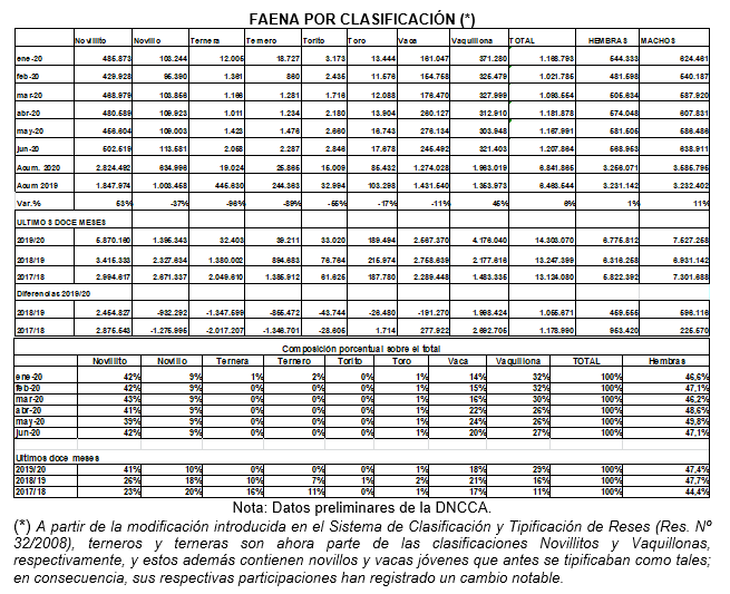 Durante abril y mayo, la composición de la faena mostró un aumento en el número y participación de hembras dentro del total sacrificado. En junio, esta tendencia se revirtió, registrando una tasa del 47,1%, mientras que paralelamente hubo un aumento en la faena de novillitos y en menor medida de novillos. De esta forma, en el primer semestre de 2020, se consolida una mayor contribución de machos dentro de la faena nacional dando una modificación importante en relación a los últimos años.