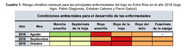 Las condiciones ambientales consideradas en forma mensual muestran el riesgo alto y medio para RA durante los meses de agosto a octubre, como también para roya de la hoja – RH (P. triticina) en septiembre y octubre. En estos dos meses, definitorios del rendimiento del trigo por hallarse el período crítico de la mayoría de las variedades, se determinó un riesgo medio para roya del tallo – RT (P. graminis-tritici) y fusariosis de la espiga – FET (Fusarium graminearum y Fusarium spp.) (Cuadro 1).