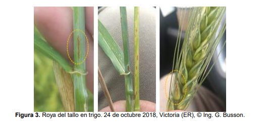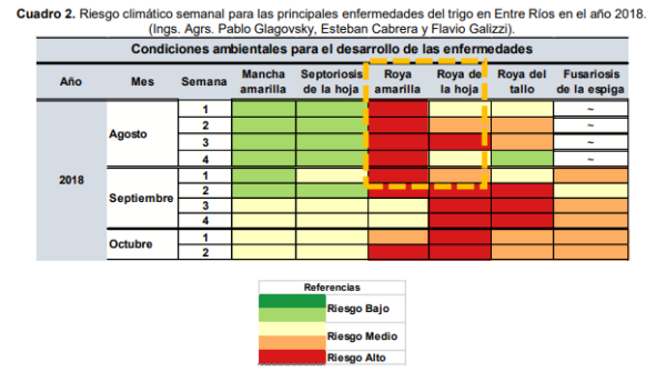 El análisis semanal de los factores climáticos conductivos muestra la cantidad de eventos favorables (Cuadro 2) a la infección a partir de las urediniosporas de las tres royas del trigo. Sin embargo, RA aparece anualmente cada vez más temprano, especialmente en esta campaña donde aproximadamente el 60% de las variedades sembradas en la provincia de Entre Ríos son susceptibles o muy susceptibles.