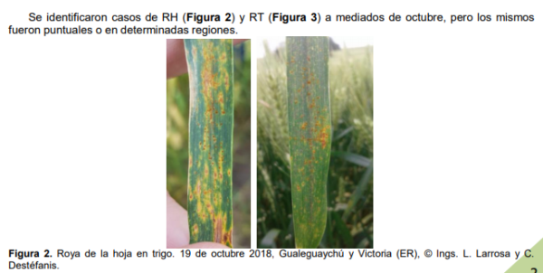 Mancha amarilla (Drechslera tritici-repentis) y algunos casos puntuales de septoriosis de la hoja (Zymoseptoria tritici) se registraron en lotes con inclusión previa de trigo en la secuencia, y presencia de rastrojo superficial. Sin embargo, la primera enfermedad registrada y dominante en 2018 fue roya estriada o amarilla – RA (Puccinia striiformis f. sp. tritici) (Figura 1). Se detectó el 5 de agosto y oficializó el 6 de agosto de 2018 en María Grande (Dpto. Paraná). A partir de este momento se iniciaron los monitoreos responsables, especialmente en las variedades conocidas como susceptibles en el año 2017.