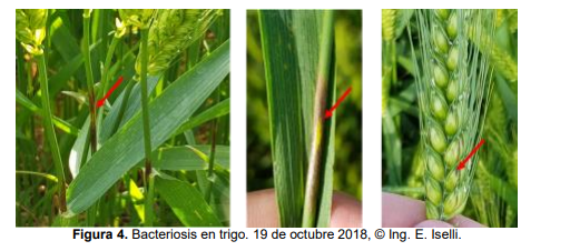 Asociado a daños de heladas en hojas, tallos y glumas se observaron síntomas compatibles con bacteriosis (Figura 4). Es relevante identificar variedades afectadas, ya que cada año se detectan con mayor frecuencia. Los posibles organismos causales de los síntomas se transmiten por semillas y pueden sobrevivir en el rastrojo y en otras gramíneas de la flora local, en forma sintomática o asintomática. Se diseminan por el viento y lluvias, entrando por heridas (ocasionadas por el viento o insectos) y estomas.