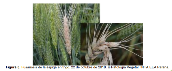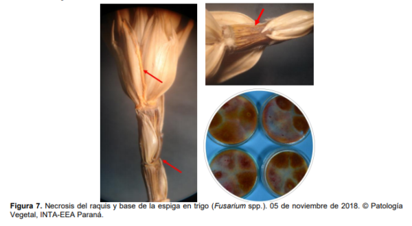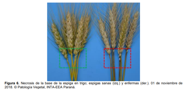 Además de los síntomas típicos de la FET (Figura 5), que se observaron con distintos niveles de incidencia y severidad en lotes puntuales, se registró la necrosis de la base de la espiga o necrosis del raquis asociado a la FET (Figura 6). Los aislamientos fueron positivos para dos especies de Fusarium (Figura 7), con efecto marcado sobre el peso de granos (muestras de los Dptos. San Salvador y Paraná).
