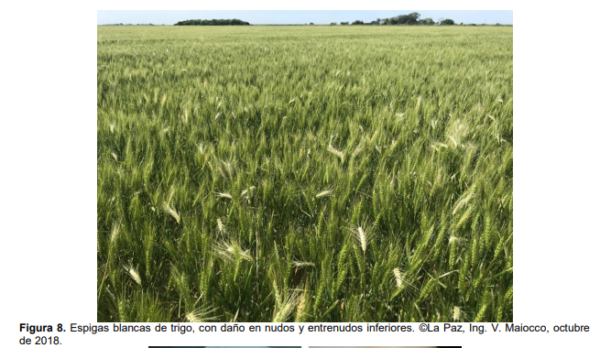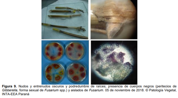 Otra anormalidad observada en diversos lotes fue la presencia de gran cantidad de “espigas blancas” (Figura 8) distribuidas en forma generalizada (Dpto. La Paz). Las causas pueden ser de diverso origen, sin embargo esta sintomatología es común en determinadas campañas con estrés hídrico y se asocian a Fusarium spp. En este caso, la presencia de nudos y entrenudos inferiores oscuros con podredumbre de raíces requirió la realización de cámaras húmedas y aislamientos de tejidos enfermos. Se identificaron como organismos causales especies de Fusarium (Figura 9).