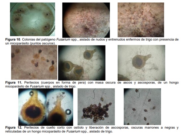 Cabe destacar que sobre las colonias puras de las colonias de Fusarium spp., se desarrollaron numerosos cuerpos fructíferos (peritecios) de un hongo ascomycete que produce gran cantidad de ascosporas (Figuras 10, 11 y 12) y parasita las hifas miceliares de Fusarium, según estudios realizados en otros países.