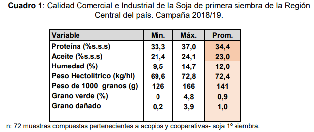 Hasta el momento se muestrearon 529.900 toneladas de soja de 1ª con buenas condiciones climáticas que favorecieron su recolección. En el cuadro 1 se presentan los valores mínimos, máximos y promedios de los principales parámetros de calidad comercial e industrial obtenidos hasta el momento.