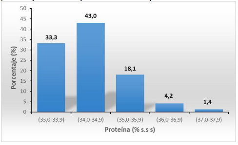 Gráfico 1. Distribución porcentual del contenido de proteína de soja de 1º siembra