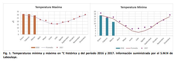 En los últimos meses los registros de precipitaciones en Laboulaye y zona fueron notablemente inferiores al promedio alcanzando en algunas zonas 30 a 70% por debajo de la media. Si bien en el primer semestre del 2017 parte de esta área estuvo afectada por severas inundaciones (Avedano y otros, 2017), la fuerte reducción de las precipitaciones causaron una disminución del agua disponible para el crecimiento de los cultivos pudiendo afectar su producción. Las condiciones de temperatura de Marzo fueron normales, aunque la media maxima supero en dos grado al promedio histórico. En la Fig. 1 se observa el promedio de la temperatura máxima y mínima mensual. La temperatura máxima absoluta fue el día 4 con 38.5°C y la Mínima absoluta fue el día 26 con 4.5°C.
