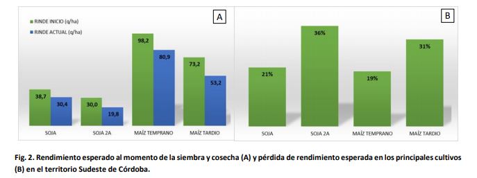 Impacto de la sequía en la producción en el territorio sudeste de Córdoba Las Agencias de Extensión Rural INTA del Territorio Sudeste de Córdoba (Laboulaye, Canals, La Carlota y Arias) realizaron un relevamiento sobre el impacto de la falta de lluvia sobre la producción agrícola y ganadera de dicha zona. En esta nota presentamos un breve resumen de los resultados obtenidos, el informe completo será publicado a la brevedad en el sitio de internet de INTA Marcos Juárez (www.inta.gob.ar/marcosjuarez). En cuanto a la actividad agrícola, sobre 224 puntos (lotes) relevados el rendimiento objetivo (al inicio de la campaña) y esperado a la cosecha se muestran en la Fig. 1.a. En soja de primera, el rinde promedio esperado a cosecha es 30 q/ha mientras que en soja de segunda es 20 q/ha. En maíz temprano el rinde esperado es de 80 q/ha mientras que en maíz tardío todas las expectativas de rindes oscilan alrededor de 53 q/ha. Las pérdidas de rendimiento estimadas como la diferencia entre el rinde objetivo a la siembra y el estimado a cosecha muestran una reducción de 21% en soja de primera y 36% en soja de segunda (Fig. 2.b). En maíz temprano la reducción de rinde sería del 19% mientras que en maíz tardío la pérdida de rinde esperada sería de 31%.