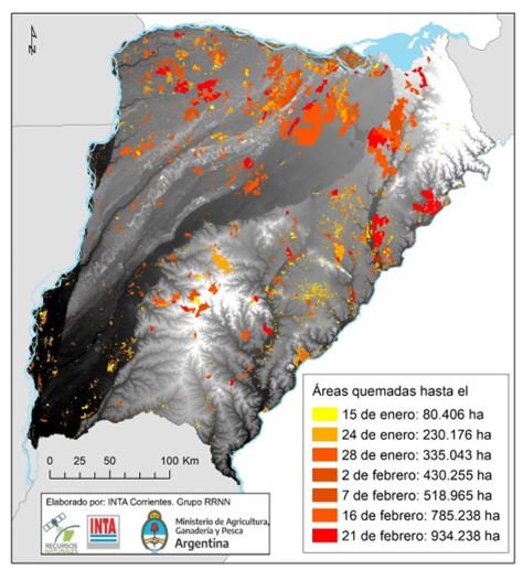 En general el ritmo de incremento de la superficie afectada es de 30 mil ha diarias. Todas las coberturas mostraron un incremento del área quemada. En valores absolutos las más afectadas por las quemas fueron las de ambientes de humedales con más de 533 mil ha acumuladas a la fecha de este informe. Sin embargo, se registró un aumento en la superficie quemada de pastizales del nordeste. Los datos de focos de calor proporcionados por el Instituto de Clima y Agua (INTA Castelar) indican que la cantidad de focos de calor en los primeros 23 días de febrero fue de 6055, de los cuales 1913 se registraron en el departamento de Ituzaingó y 814 en Santo Tomé, lo que explica el incremento de superficies quemadas en estos departamentos.