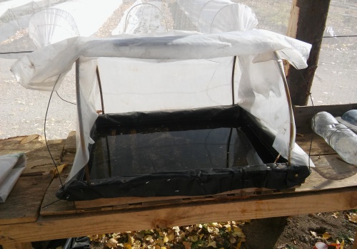 La plantinera retoma el sistema de riego y consiste –básicamente– en un compartimiento de madera cubierto con polietileno o con cualquier material impermeable como bolsas de consorcio de alta densidad, donde se disponen dos bandejas de cultivo y un flotante que regula la cantidad de agua.