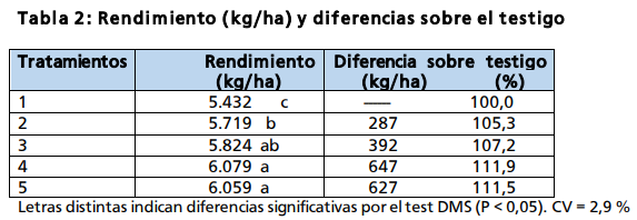 El año fue muy adecuado para el desarrollo del cultivo. Las lluvias (Gráfico 1), fueron algo excesivas en el mes de enero, febrero se presentó seco y con muy buena luminosidad, esto ayudado por la napa freática, al alcance del sistema radicular, permitió obtener muy buenos rendimientos. El análisis estadístico (variancia), mostró diferencias (p < 0,05), en función de esto se compararon las medias mediante el test de la diferencia mínima significativa (DMS) al 5 % de probabilidad (Tabla 2). Todos los tratamientos ensayados alcanzaron un rendimiento, en valores absolutos, superiores al testigo, diferenciándose estadísticamente de él.