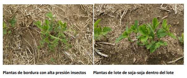 La coincidencia de la emergencia de adultos de Megascelis con Soja transitando los primeros estadíos de crecimiento merece mayor atención ya que produce una defoliación intensa retrasando el desarrollo normal de las plantas afectadas. Es importante destacar varios aspectos relacionado a este coleóptero ya que sus poblaciones cada vez son mayores pasando desapercibida la segunda generación en cultivos ya desarrollados pero que dichos adultos dejaran la descendencia para la próxima emergencia de adultos en los meses de noviembre-principios diciembre. Según lo expuesto aquellos lotes cuyo antecesor también sea soja van a tener un carga mayor que aquellos en lo que sea maíz, por otro lado la mayor intensidad de daño se observa en borduras cuyos lotes linderos poseen trigo o maíces ya que al no ser hospedero no lo consume e infesta la soja que más cercana se encuentre. A pesar de observar niveles poblacionales muy altos por plántula en borduras que producen una defoliación muy intensa posee la particularidad de no consumir cotiledones y no afectar el ápice de crecimiento ni las hojas nuevas emergiendo y solo consumiendo hojas ya desplegadas salvo en plantas con una gran cantidad de adultos por lo que de no poder entrar para controlarlo ya sea por falta de piso u otros motivos la soja debería recuperarse ya que los lotes se encuentran a capacidad de campo aunque existe un déficit de radiación por cantidad de días nublados o con precipitaciones. De decidir un control químico ya sea solo en cabeceras o en todo el lote los piretroides poseen un excelente control.