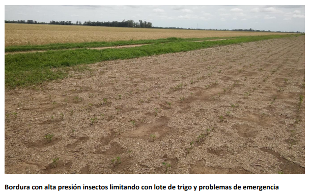 La implantación del cultivo de Soja de Primera se ha desarrollado con normalidad en Octubre pero aquellas realizadas a partir de noviembre tuvieron ciertas dificultades debido a problemas de piso por exceso de humedad o efecto de intensidad de tormentas que han afectado el stand de plantas o produjeron daños de variada intensidad principalmente en lotes no rotados. Lo maíces de primera se encuentran entre 6 y 10 hojas con problemas de control de malezas que posiblemente hayan escapado a la acción de herbicidas residuales por excesos hídricos sin que ocurriesen dificultades de plagas que afectasen la implantación aunque se observan algunos daños puntuales que fueron producto del daño de chinche de los cuernos. Para la zona de Marcos Juarez según lo observado durante más de 10 años no se observan infestaciones importantes de la oruga cogollera afectando maíces de siembras tempranas.