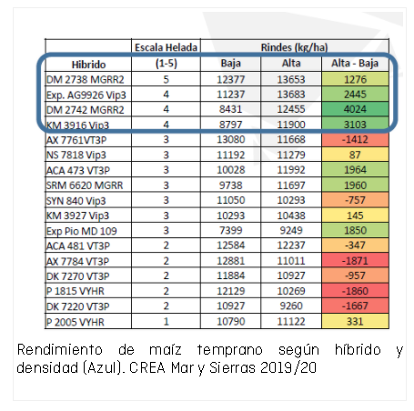 La interacción densidad/híbrido es un aspecto crucial para diseñar cultivos de maíz temprano en la región CREA Mar y Sierras con capacidad para resistir el impacto de heladas tardías.