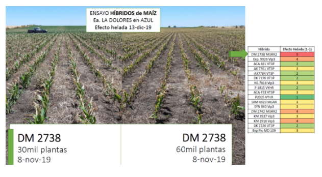 El ensayo evidenció que los híbridos DM 2738 MGRR2, DM 2742 MGRR2 y KM 3916 Vip3 mostraron un mejor comportamiento frente a la helada tardía con una densidad de 60.000 plantas/ha versus otra de 30.000 plantas/ha.
