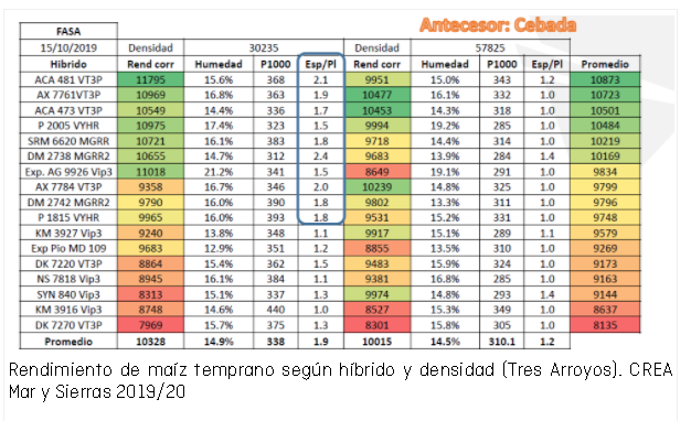 Por su parte, en las siembras tempranas (15 de octubre) realizadas en la localidad de Tres Arroyos los ensayos realizados por los grupos CREA de la región Mar y Sierras mostraron que los híbridos más destacados pudieron expresar su mayor potencial en densidades bajas (30.235 plantas/ha) que en altas (57.825 plantas/ha).