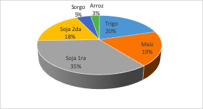 Para esta estimación, se toma en cuenta, el promedio de superficie sembrada de los últimos cinco años de los principales cultivos, como una forma de estimar la superficie que en promedio podría ser sembrada en la próxima campaña en la provincia. Se considera la información oficial de las últimas cinco campañas, dando un promedio de 2.282.174 hectáreas totales de los cinco cultivos, distribuida de la siguiente manera: