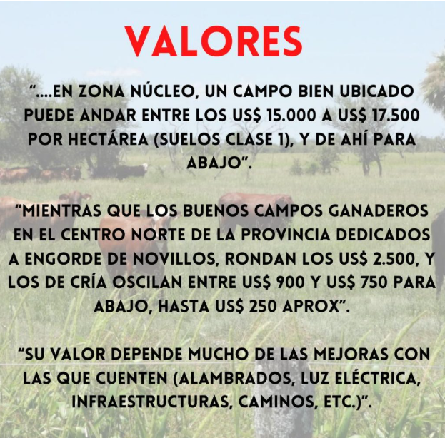 “La brecha entre la ficción del dólar oficial y el verdadero blue, MEP o contado con liquidación, dificulta las operaciones. Los campos buenos (agrícolas zona núcleo) se siguen comercializando en valores de dólar billete y los campos marginales o ganaderos, ya escuchan ofertas en pesos y financiación en kilos de carne” expresó el especialista en tierras rurales.