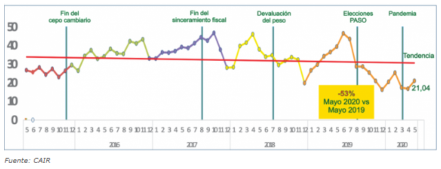 El impacto de las diversas cotizaciones del dólar que describe Cardín coincide con el panorama que muestra la Cámara Argentina de Inmobiliarias Rurales (CAIR), que en su índice de mayo reporta una importante caída de la actividad (-53% vs. mayo 2019); y sostiene que desde el inicio de la pandemia, el sector atraviesa ”una tormenta de arena donde todas las referencias para orientarse se perdieron o se tornaron muy difusas y cambiantes”, que hizo detener al mercado.