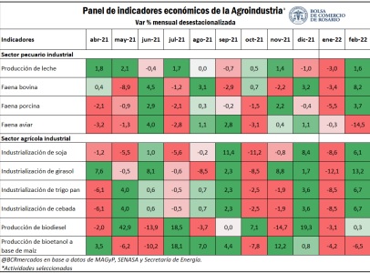 Los únicos sectores en donde se registraron disminuciones desestacionalizados en febrero fue el sector de carne aviar y la producción de bioetanol a base de maíz. En febrero se registró una fuerte caída en la faena de aves del 14% respecto al mes de enero y un 11,2% respecto a igual mes del año pasado. La faena de aves fue la más baja en 12 años. El otro sector donde se registró una caída mensual fue en el etanol a base de maíz. La producción tuvo una caída del 6,5% mensual, pero se mantuvo en igual nivel que el año pasado. La demanda del etanol se encuentra muy correlacionada con el nivel de actividad económica y el corte obligatorio en las naftas
