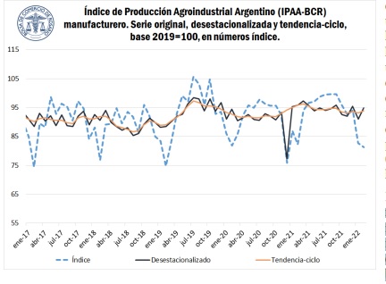 En el mes de febrero de 2022, la actividad de la agroindustria nacional medida por el índice de producción agroindustrial (IPA) manufacturero registra un aumento del 4,2% mensual. El aumento mensual se registró en todos los sectores salvo en el sector aviar y el de bioetanol.