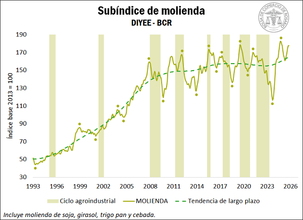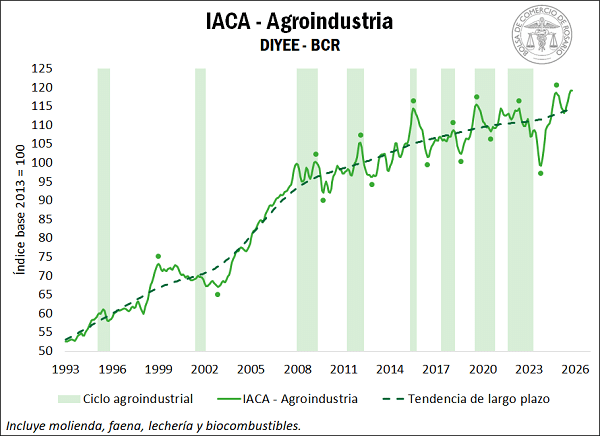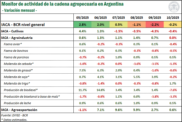 El Índice de Actividad de la Cadena Agropecuaria (IACA-BCR), elaborado por la Bolsa de Comercio de Rosario, registró en octubre un crecimiento interanual del 4%. Pese a una leve baja mensual del 0,2%, la agroindustria se mantiene en niveles históricos y el sector exportador encadenó su quinto mes consecutivo en alza.