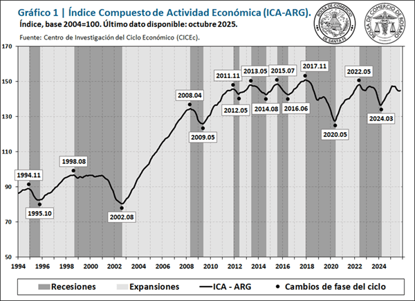 La actividad económica argentina mostró en octubre un leve pero significativo avance, según el último informe del CICEc. El ICA-ARG creció un 0,1% mensual, interrumpiendo una tendencia de retrocesos que se había extendido desde marzo. Pese a este rebote, el indicador aún está 1,8% por debajo del máximo de febrero, aunque se ubica 6,1% por encima del mínimo de marzo de 2024, lo que confirma que la economía atraviesa una fase de transición con señales mixtas.