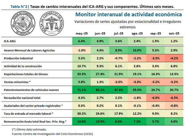El Índice Compuesto Coincidente de Actividad Económica (ICA-ARG) registró en octubre un incremento del 0,1%, recuperándose tras siete meses de caídas y manteniendo una variación interanual positiva del 1,2%. El repunte se apoyó en mejoras en la construcción, la recaudación nacional, las importaciones y los salarios privados, aunque persisten señales de debilidad en la industria, el empleo y los patentamientos.