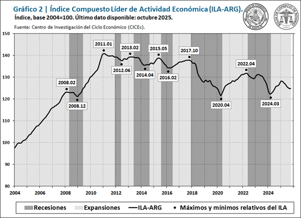 El Índice Líder de Actividad (ILA-ARG) también cortó su racha negativa, con un leve avance del 0,02% en octubre. Ocho de los doce indicadores líderes mostraron mejoras, entre ellos la base monetaria, el gasto de capital y el índice de confianza del consumidor.