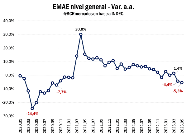 Luego de un 2021 con una recuperación acelerada y un 2022 de consolidación del crecimiento, llegamos a 2023 con algunos signos de agotamiento. Con una recuperación en enero del 2,7% interanual, que no pudo consolidarse, en febrero no se registraron variaciones en el nivel de actividad que fue seguido por un leve aumento en marzo y finalmente abril registró una caída i.a. de 4,4% para que luego mayo reafirmara esta tendencia.